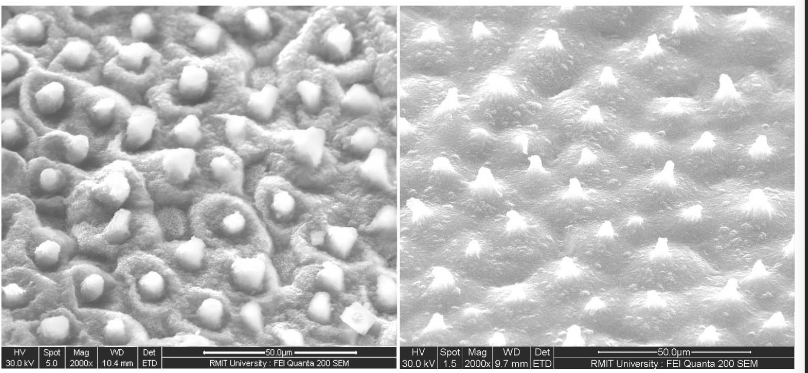 顯微鏡下的荷葉(左)和新生物塑料(右)的柱狀結構的2000放大圖像