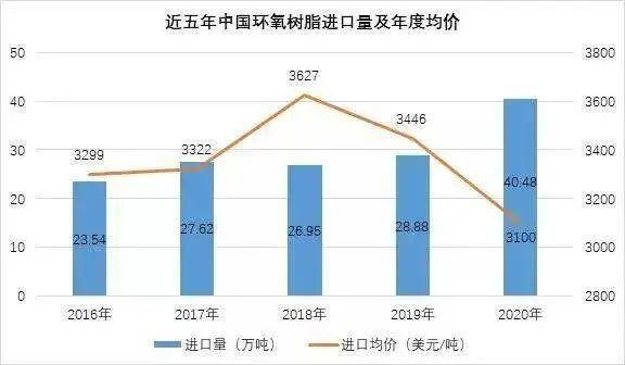 2017年-2020年我國環氧樹脂進(jìn)口(kǒu)量分別是27.62萬噸、26.95萬噸、28.88萬噸、40.48萬噸。2020年進口(kǒu)量大幅增加,同(tóng)比增長高達40.2%。這些數據(jù)的背後,跟當時國內環(huán)氧樹脂的產能不足息息相關。