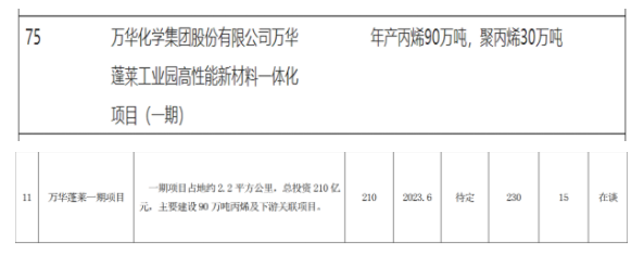該(gāi)工業園項目(一期(qī))已入選“2022年山東省重點項目(mù)名(míng)單”,從中(zhōng)了解到,項目主要建設90萬噸丙烯、聚丙烯30萬噸。另外,蓬萊區人民政府在2021年8月底發布《煙台市蓬萊區(qū)人民政府辦公室印發關於(yú)推進綠色化工(gōng)產業高質量發展三年行動(dòng)方案的通(tōng)知》,從中提到萬華蓬萊一期項目總投資210億元,計劃2023年6月開工,達產後效益達到230億元。