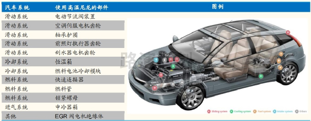 在汽車領域,耐熱塑(sù)料正在取代傳統(tǒng)的(de)工程塑料和(hé)一些金屬。汽車領域的這一(yī)替代需求主要由以下幾點原(yuán)因(yīn)推動:1)更高的安全性和舒適性要求;2)更(gèng)長的使用壽命(mìng)要求;3)發動機(jī)零件溫度升高(gāo);4)汽車電動化趨勢下電(diàn)路(lù)布局更加複雜。高溫尼龍具有良好的機械(xiè)、抗蠕變和耐(nài)高(gāo)溫疲勞(láo)等性能(néng),是一(yī)種理(lǐ)想的(de)替代材料,適(shì)用於發(fā)動機、傳動係統、空氣係統和進氣裝臵等部位,例如使用高溫尼龍製成的鏈條(tiáo)拉緊器其磨損程度遠小於 PA66。隨著(zhe)汽(qì)車電氣化的快速(sù)推(tuī)進,高溫尼龍在汽車領域的需求有望迎來高速增長。
