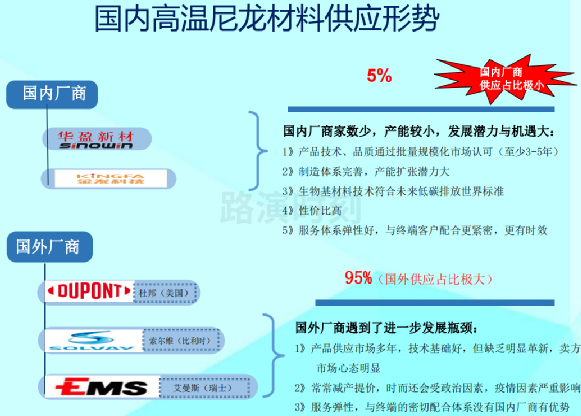 我國高(gāo)溫尼龍進口依賴度高達95%,國內能穩定批量(liàng)生產且獲(huò)得知名客戶測試認證主要包括金發科技和華盈新材等,未(wèi)來(lái)隨著國內廠家(jiā)的產能規劃逐步落地,有望在電子領域率先實現(xiàn)進口替代,而下遊汽車領域驗證周期較長,替代進度預計稍微慢一些。