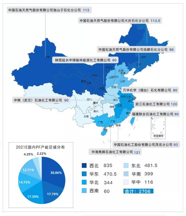 在大乙烯時代,企業多為煉化一體化,湧現(xiàn)了浙江石化、煙(yān)台萬華、恒力石(shí)化等地方企業,迅速(sù)擠占市場。從地域分(fèn)布來看,聚乙烯生產企(qǐ)業仍集中在主要消費地華北、華東(dōng)、西北地區,地域內規模以上(shàng)製品企業集中。從消費來看,像華北的農膜、管材(cái)、包裝,華(huá)東的管(guǎn)件、包(bāo)裝、日用注塑中空等,考慮物流運輸、采購穩定性等因素,圍繞主要(yào)製(zhì)品需求地(dì),生(shēng)產企業也較為集中。聚乙烯本身屬於進口依存度較高的產(chǎn)品,刨除國內(nèi)供給(gěi),仍依托沿海青島、上海(hǎi)、寧(níng)波、黃埔等港(gǎng)口進口來自中東等地資源。企(qǐ)業分布情況如下。