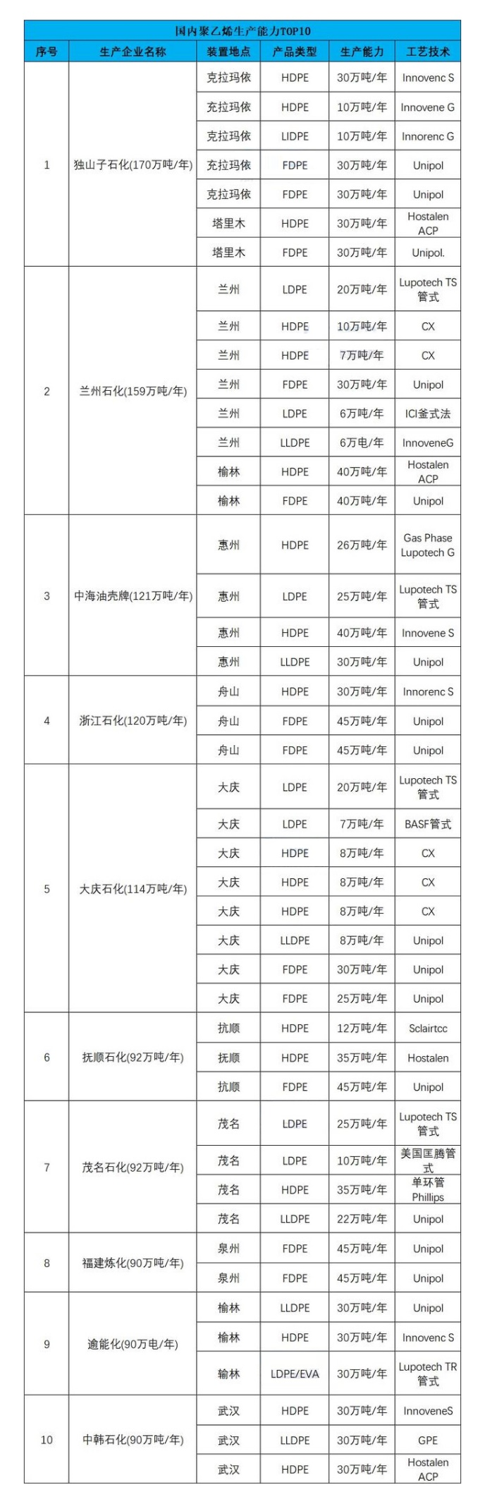 此外,有中科煉化、福建煉化、撫順石(shí)化、萬華(huá)化學、恒力石(shí)化、中安聯合也都(dōu)有聚乙(yǐ)烯產品。