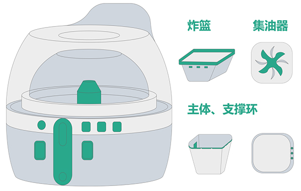 空氣炸鍋主體/支撐環/炸(zhà)欄/集油(yóu)器選Ryton® PPS、Amodel® PPA和Ominx® HPPA