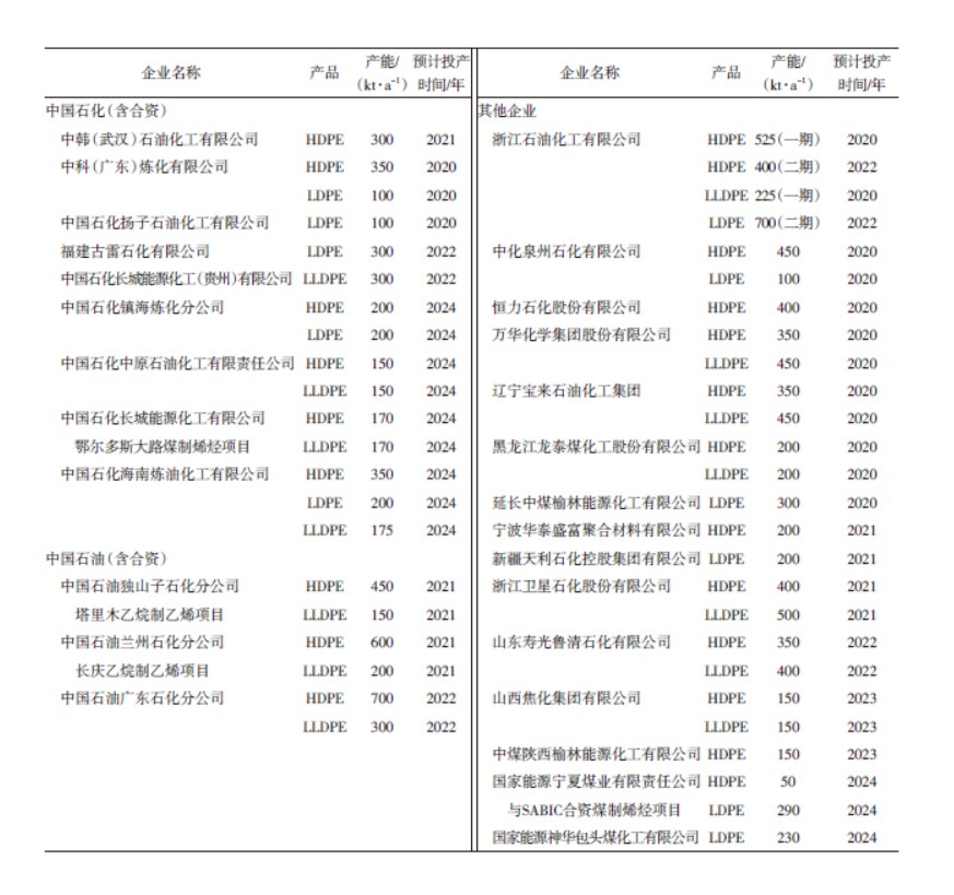 從下表可以看出:2020年受新冠肺炎疫(yì)情影響(xiǎng),預計我國PE產量將有所下降,為14.04 Mt。隨著新冠肺炎疫情的(de)有效控製,新增產能的相繼投產,以及PE下遊需求量的持續增(zēng)加,我(wǒ)國PE產量將持續增長,預計到2024年將達到24.90 Mt。