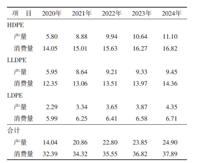 2020年,受年初突發新冠肺炎疫情的影響,終端消費市場的需求受到一定的抑製,但隨著國內(nèi)複工複產(chǎn),經濟生活有序恢複,PE消費量仍會略微增長,預計2020年PE消費(fèi)量約為32.39 Mt,同比增長0.8%。其中,HDPE為14.05 Mt,LLDPE為12.35Mt,LDPE為5.99 Mt。伴隨新冠肺炎疫情的有效控製,更大力度財稅政策的出台,以及擴大內需政策的穩步推進,2021年,我國經濟將實現較快發(fā)展,PE消費量也將增至34.32 Mt。2022—2024年,PE消費量將保持年均(jun1)3.3%的增長率。預計到(dào)2024年,我國PE消費量將達到37.89 Mt。其(qí)中,HDPE消費量為16.82 Mt,自給(gěi)率約66.0%,消費缺口約5.70 Mt;LLDPE消費量為(wéi)14.36 Mt,自給率約(yuē)66.0%,仍有約4.90 Mt的消費缺(quē)口;LDPE消