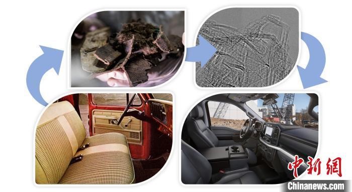 示意圖展(zhǎn)示了廢(fèi)舊汽車塑料在填埋場被切碎但回收(shōu)升級為石墨烯的過程 (圖源(yuán):福特汽車公司和萊斯大學)