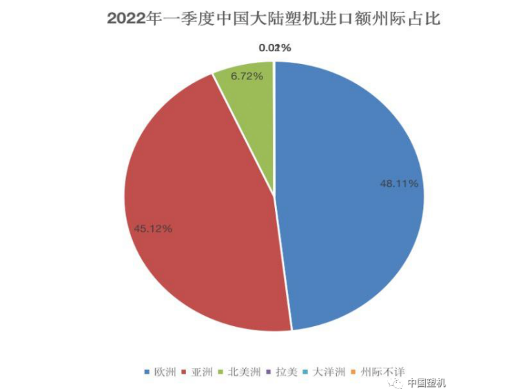 進口分布(bù):從洲際看,2022年一季度中國大陸從歐洲進口塑機金額3.67億美元,同(tóng)比增長79%;從亞洲進口塑機金額3.44億美(měi)元(yuán),同比增長31%。在進口來源地前十位中,從日本、德國的進口額依然位居前兩位,進口額分別為2.60億元、2.57億元,同比分別增(zēng)長24%、86%;中國台灣、意大利、美國位列第三、四、五位,進口額分別為4594萬美元、4227萬美元、3304萬美(měi)元,同比分別(bié)增長64%、37%、106%。