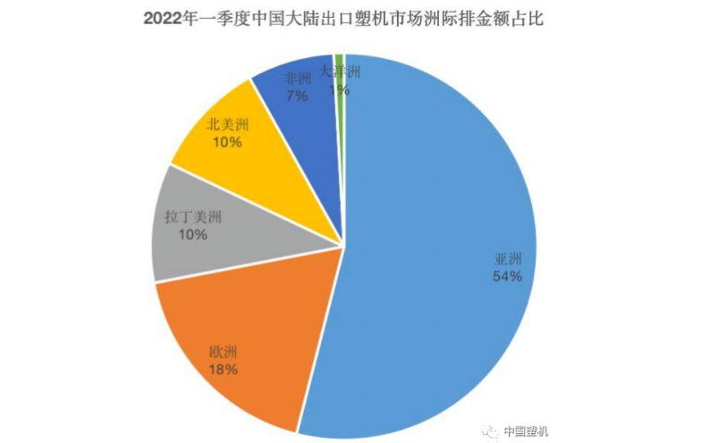 出口分布:從洲際看,2022年一季度中國大陸塑機出口至各大洲的金額全麵增長:至(zhì)亞洲(zhōu)出口額為8.9億美元,同比增長111%;至歐洲出口額近3.0億美元,同比增長95%;出口(kǒu)至拉丁美洲和北美洲分別為1.7億美元(yuán)和1.6億美元,分別同比增長67%、79%;出口至非洲為1.2億美元,同比增長了53%。