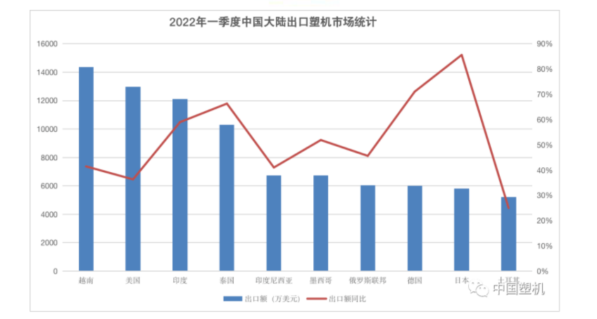 根據海關總署數據統計,2022年一季度中國大陸(lù)塑料機械(15個稅(shuì)號,包括零部件(jiàn))進出口總額(é)為(wéi)24.1億美元,其中,進口額7.6億美元(yuán),同比增長57%;出口額(é)16.5億美元,同比增長93%;貿易順差(chà)8.9億美元,同比增長141%。