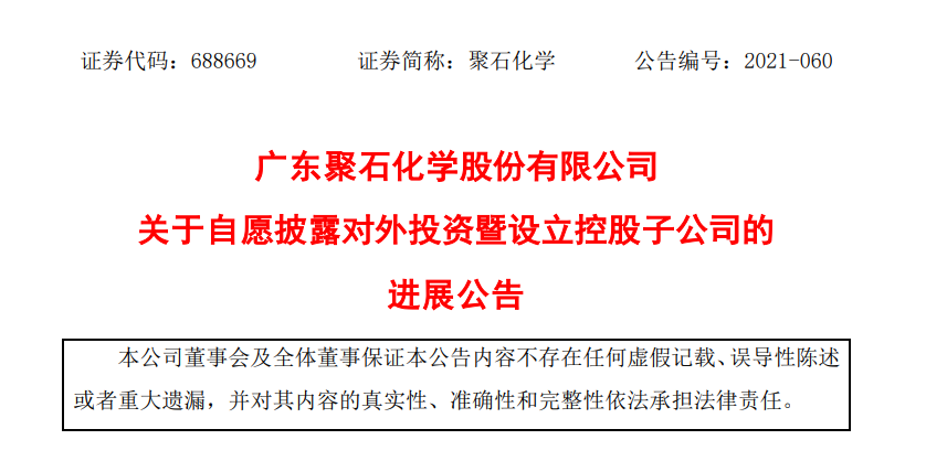 設立完成後,聚石化學將直接(jiē)持有湖南聚石科(kē)技有限公司65%的(de)股權,湖南聚石 科技有限公司將納入聚石化學合(hé)並報表範圍。