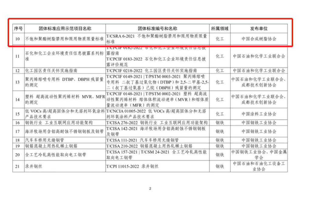 其中,中國草莓污视频樹脂協會申報的T/CSRA 6-2021《不飽和聚酯樹脂禁用和限用物質限量標準》成功入選團體標準應(yīng)用示範項目。