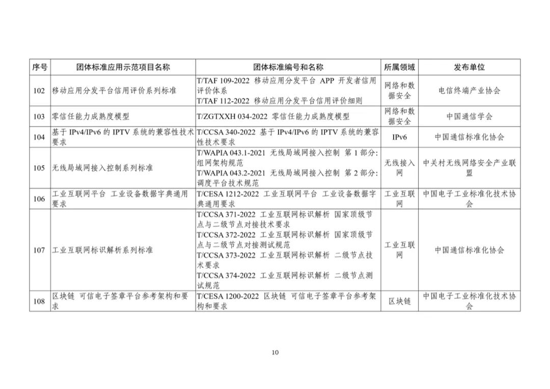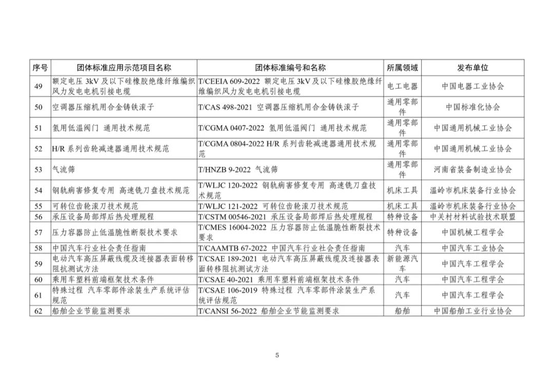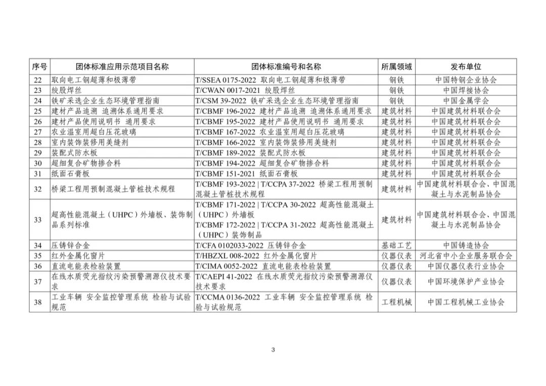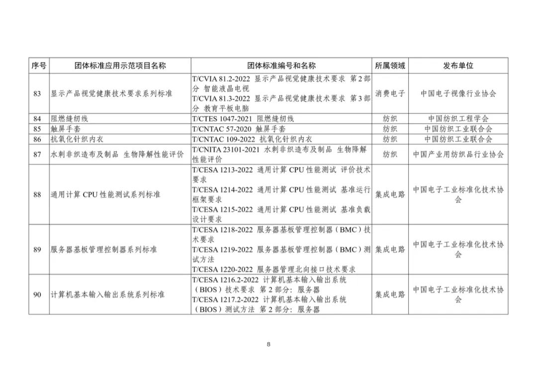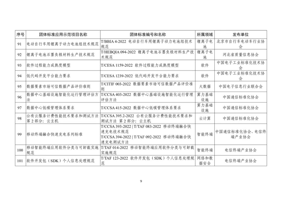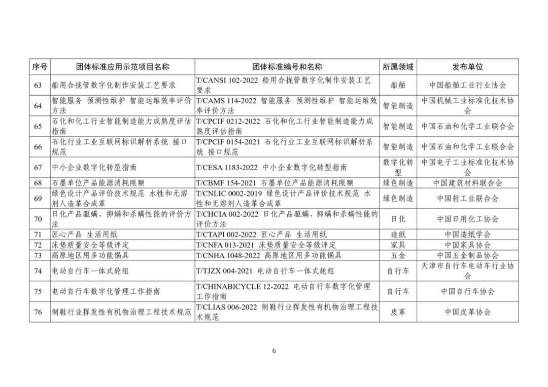 為深入貫徹落實《國(guó)家標準化發展綱要》,大力發展團體標準,推進團體標準應用示範,根據(jù)《工業和信息化部辦公廳關於開展2023年百項團體標準應用示範項目申報工作的通知》(工信廳科函〔2023〕165號)要(yào)求,經自願申報、地(dì)方或行(háng)業推薦、專家(jiā)審查和社會公示(shì)等(děng)環節,我部遴選(xuǎn)出109項2023年團體標準應用示範項目(名單見附(fù)件),現予以公布。