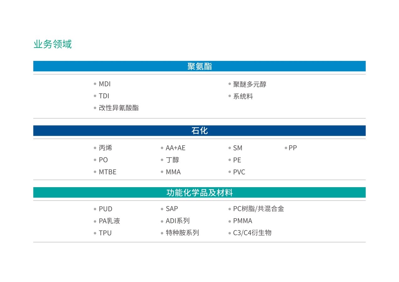 萬華化學始終(zhōng)堅持以科技創新為第一核心競爭(zhēng)力,持(chí)續優化產業結構,業務涵蓋(gài)MDI、TDI、聚醚多元醇等聚氨酯產業集群,丙烯酸及酯、環氧丙烷等(děng)石化產業集群,水性PUD、PA乳液、TPU、ADI係列等功能化學品及材料產業集群。所服務的行業主(zhǔ)要包(bāo)括:生活家居、運動休閑、汽車交(jiāo)通、建築工業和電子電器等。