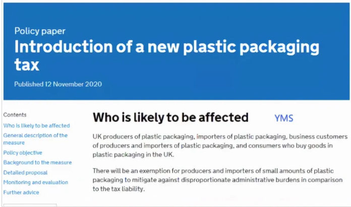 除了歐盟外,英國稅務與(yǔ)海關總署也於去年11月發布了一項新稅種(zhǒng),即塑(sù)料(liào)包裝稅(shuì)(PPT),適用於在英國生產或進口到英國的(de)塑料包裝。該決議已在(zài)2021年《財政法案》中得到了立(lì)法,將從(cóng)2022年4月1日起生效。