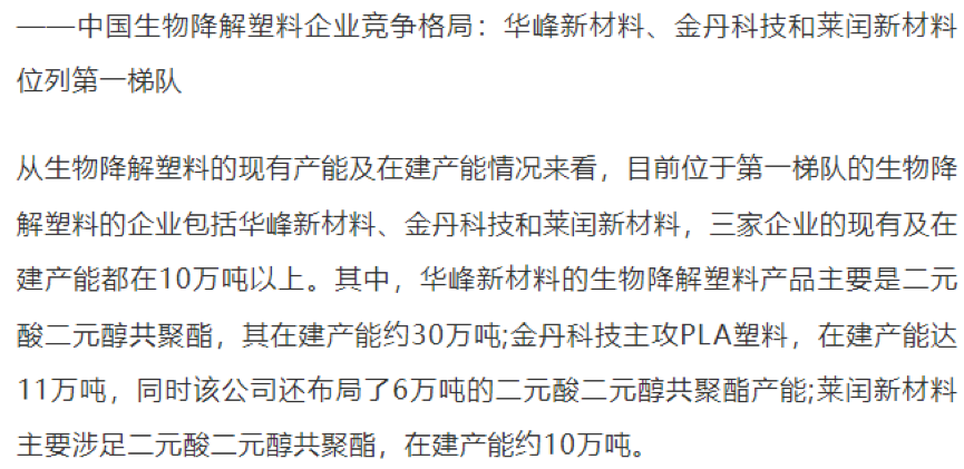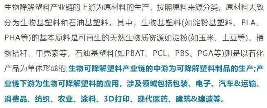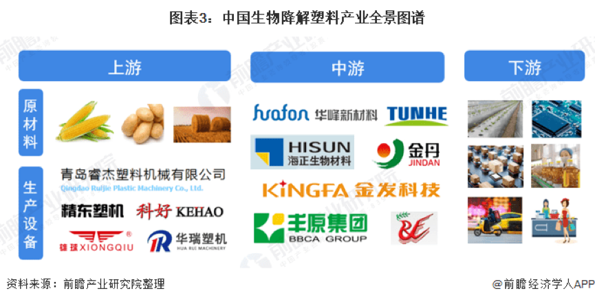 目(mù)前,我國生物降解產業的上遊主要是農戶和相關設備供應商;中遊參與者包括華峰新材料、金丹科技、海正生物材料、金(jīn)發科技等等;下遊應用領域廣發(fā)、客戶眾多,既包括企業也包括個人消費者。