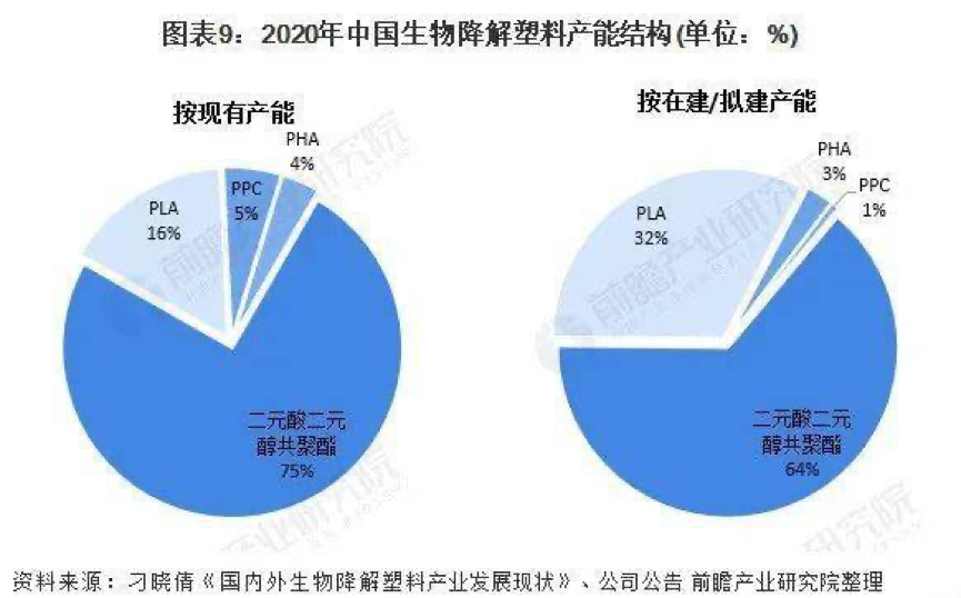 生(shēng)物降解塑(sù)料主要包(bāo)括PLA、PHA、PPC和二元酸二(èr)元醇共聚酯,從(cóng)目前的產能(néng)結構來(lái)看,我國現有產能、在建/擬建產能均以二(èr)元酸二元醇共聚酯(屬於石油基)為主,其(qí)次是PLA(屬於生物基)。