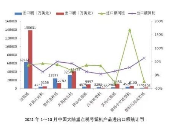2021年1~10月中國大陸塑料機械12個重點(diǎn)稅號產品進出口總額48.39億美元(yuán),同比增長35.18%。其中,進口(kǒu)額17.96億美元,同(tóng)比增長30.13%;出口額近(jìn)30.43億美元,同比增長38.34%;貿易順差近12.47億美元(yuán),同比增長52.17%。