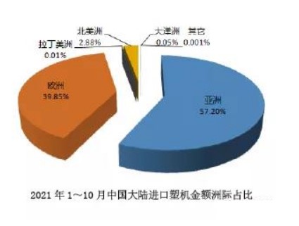 按進口來源看,2021年(nián)1~10月中國大陸從亞洲進口12個稅號塑機金額近10.28億美元,同比(bǐ)增長37.32%;從歐洲進口額7.16億美元,同比增長(zhǎng)21.67%;從北美洲進口額為5179萬美元,同比增長(zhǎng)21.30%。